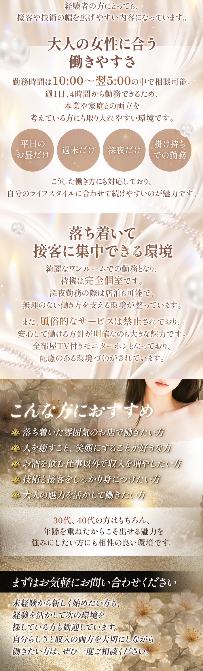 土地柄、裕福で余裕のある紳士的なお客様が多くご来店され頑張った分だけしっかり稼げるシステムになっております。